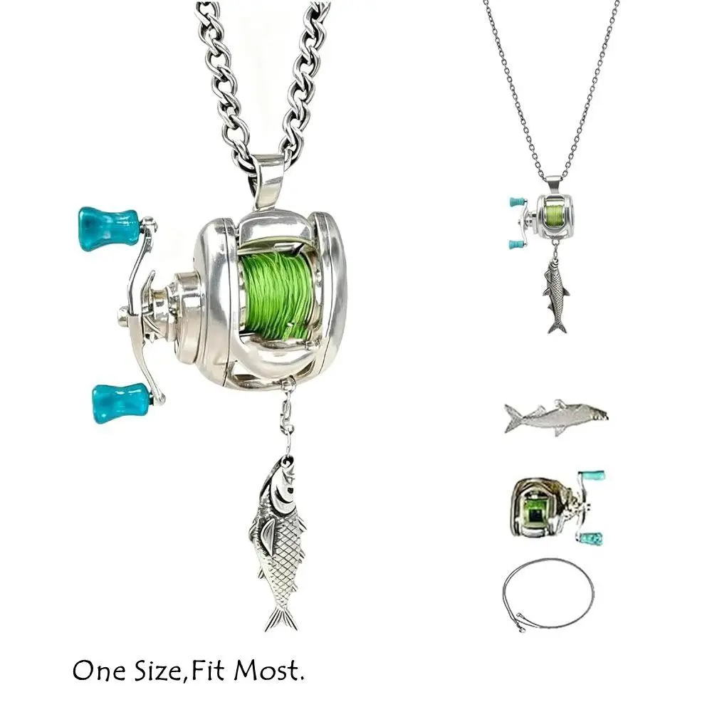 Mini Fishing Reel Necklace Fishing Rotating Handle & Moving Line Guide Spinning Reel Keychain Backpack Charm for Fishermen